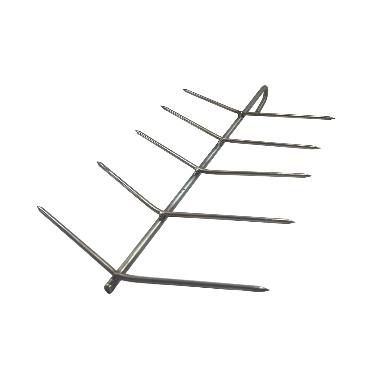 Su estructura con múltiples puntas permite sujetar varios chorizos al mismo tiempo, manteniéndolos en la posición ideal para una cocción pareja. Esto facilita una mejor circulación del calor y el humo, logrando un dorado perfecto por fuera y jugosidad por dentro.
