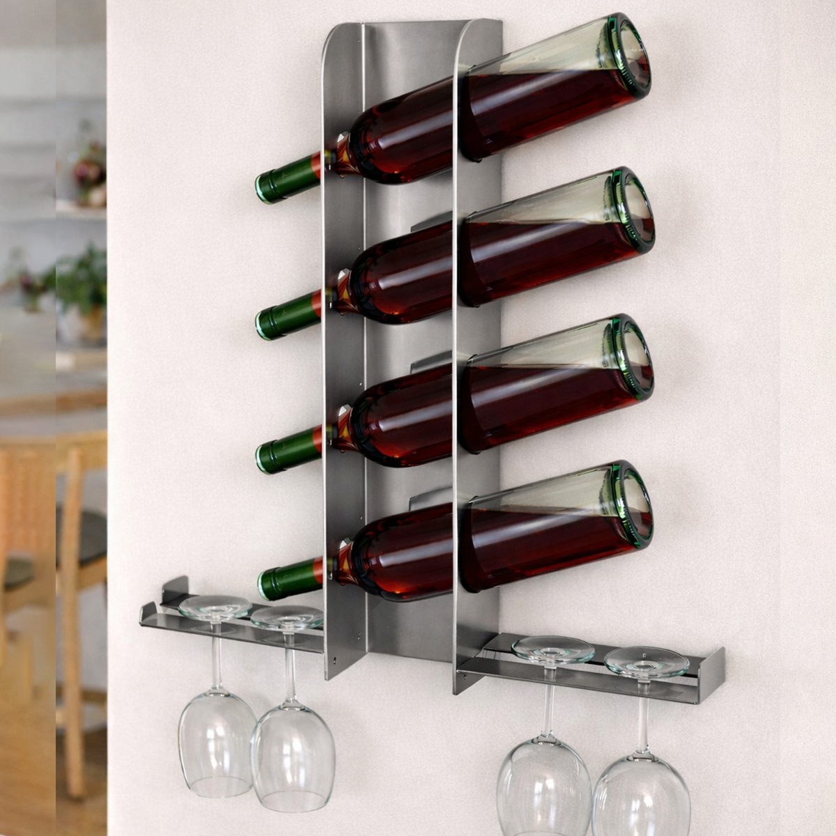 Nuestra Vinoteca de Pared en Acero Inoxidable con Soporte para Copas está diseñada para quienes buscan combinar elegancia, funcionalidad y aprovechamiento del espacio. Su estructura moderna permite exhibir y almacenar botellas de vino de forma segura, manteniéndolas en posición horizontal para conservar correctamente sus propiedades.